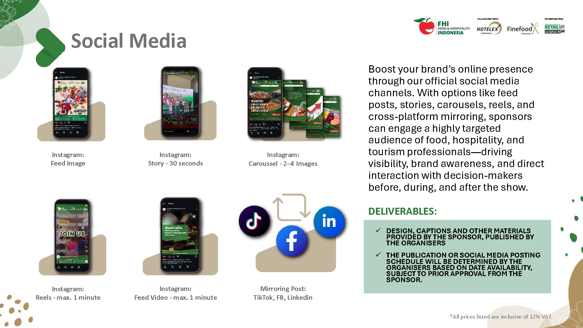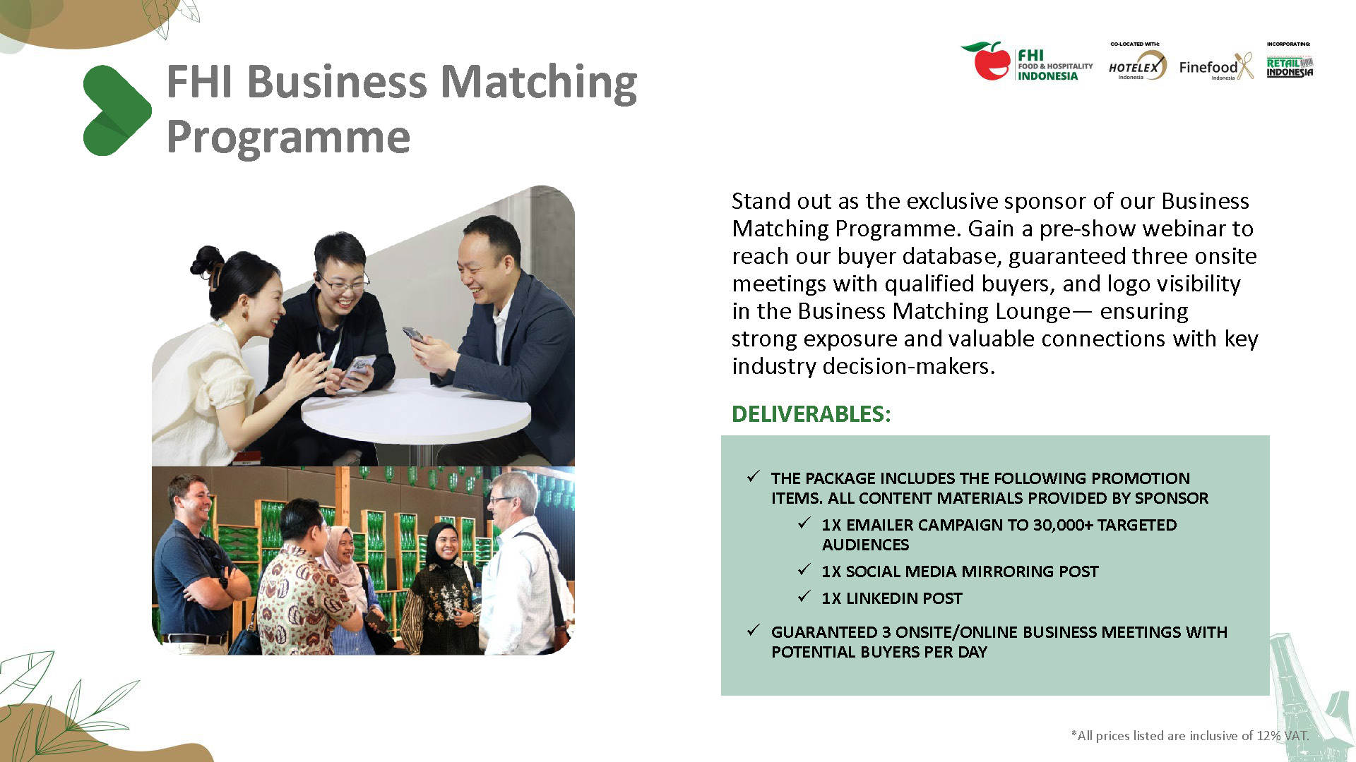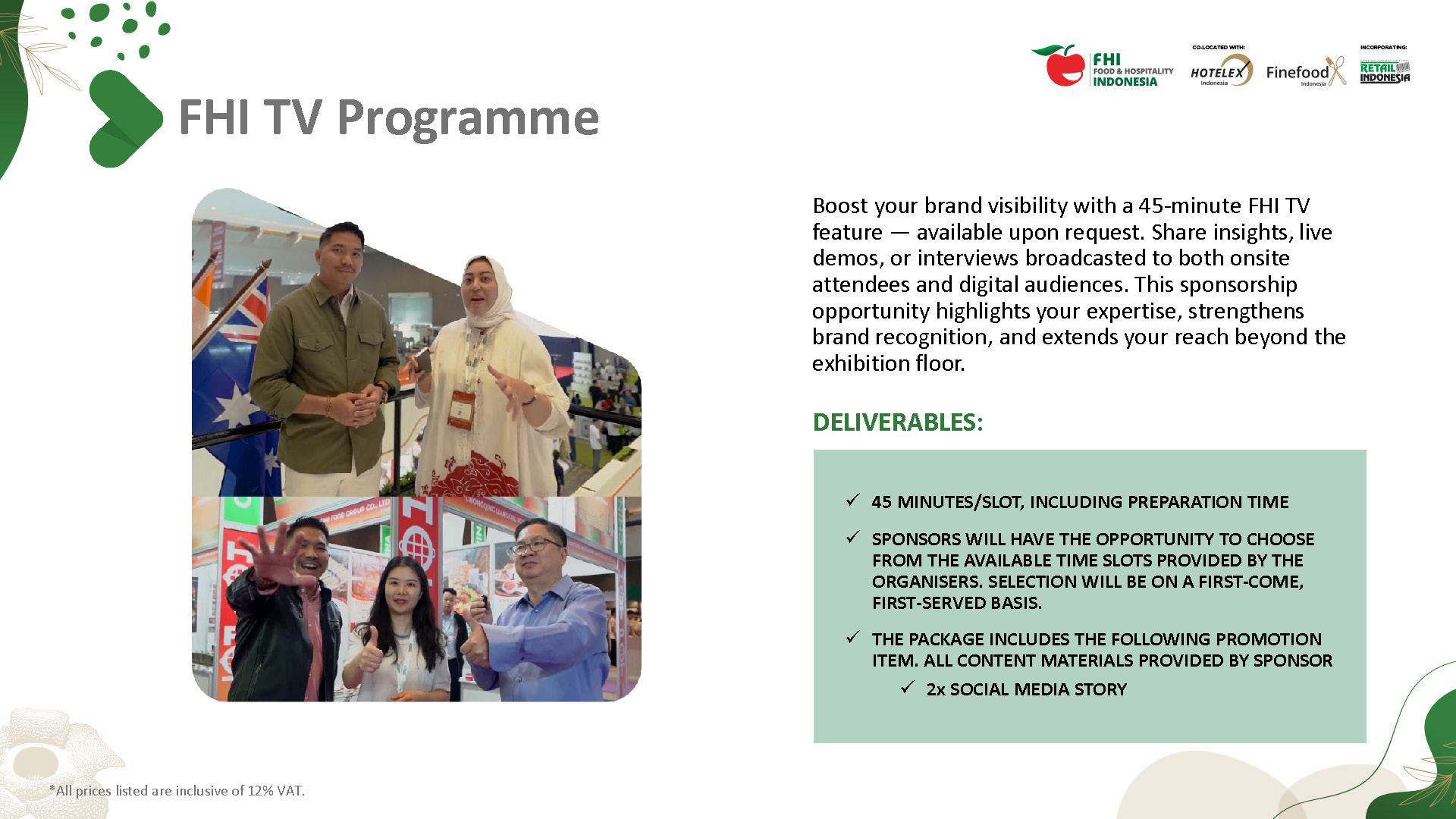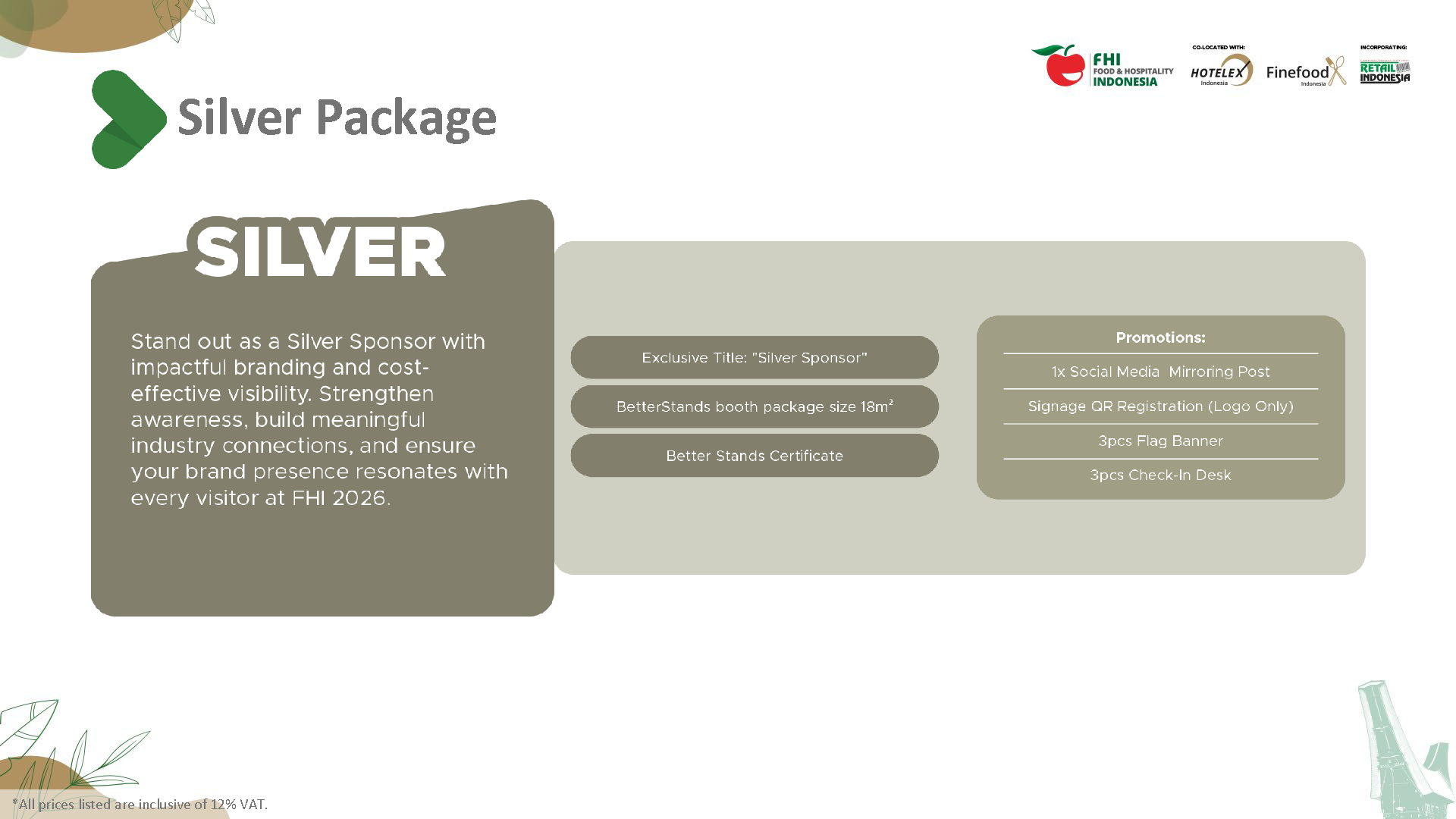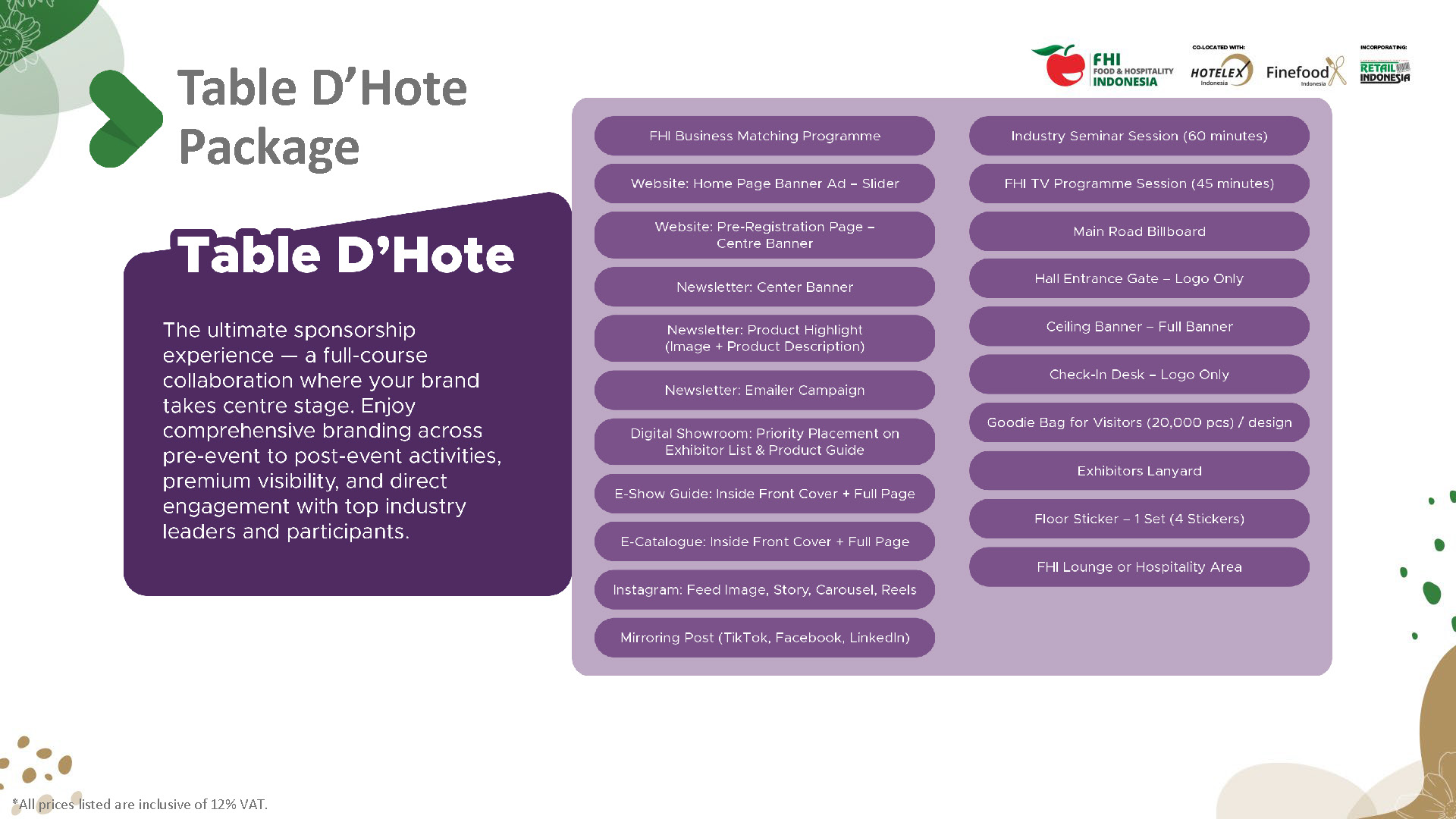 Step into the spotlight at the 19th edition of Food & Hospitality Indonesia – your ultimate platform to connect with industry leaders, top professionals, and global brands. Securing your spot is just the beginning. Amplify your brand, draw in visitors, and make a lasting impression with our tailored sponsorship and advertising solutions. This brochure presents a range of impactful opportunities to fit every budget. Our team is here to help you find the perfect options to enhance your visibility and influence at the event. Engage with key buyers and influencers, build brand recognition, and unlock growth potential with FHI’s sponsorship and advertising options.